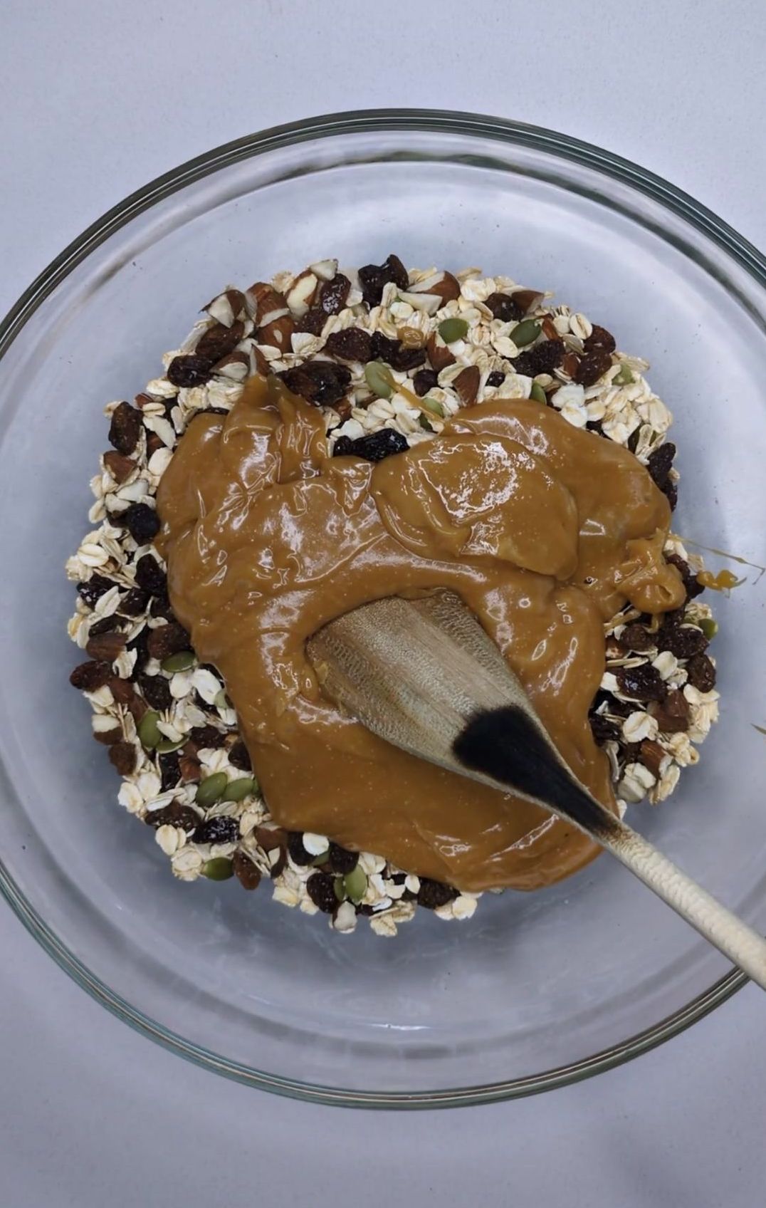 Step 3: Immediately add the sauce to the dry ingredients and combine them using a wooden spoon. Keep going until all dry ingredients are coated. Some elbow-grease is required.